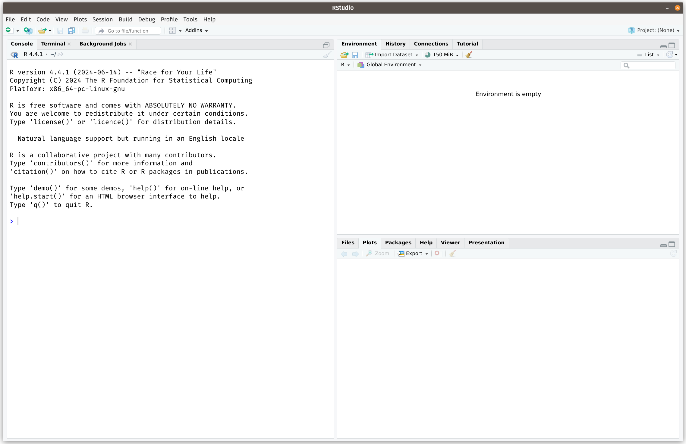 After these two steps, you can open RStudio in your system, as you would with any program. You should see something like this: