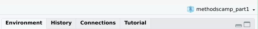 You should now have a folder called methodscamp_part1/ on your computer. Navigate to the methodscamp_part1.Rproj file within it and open it. RStudio should open the project right away. You should see methodscamp_part1 on the top-right of RStudio—this indicates that you are working in our RStudio project.