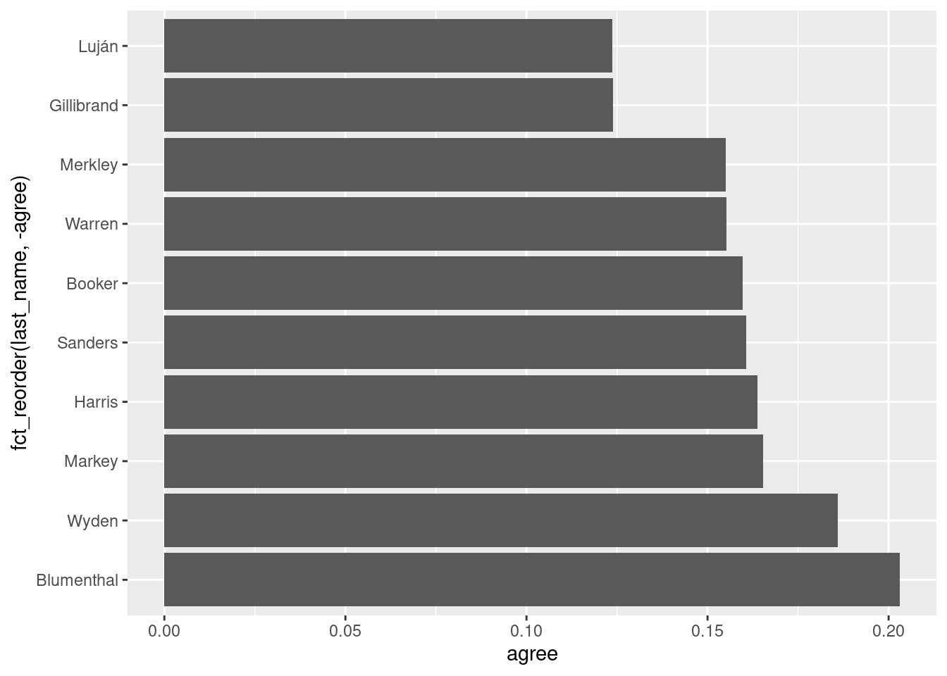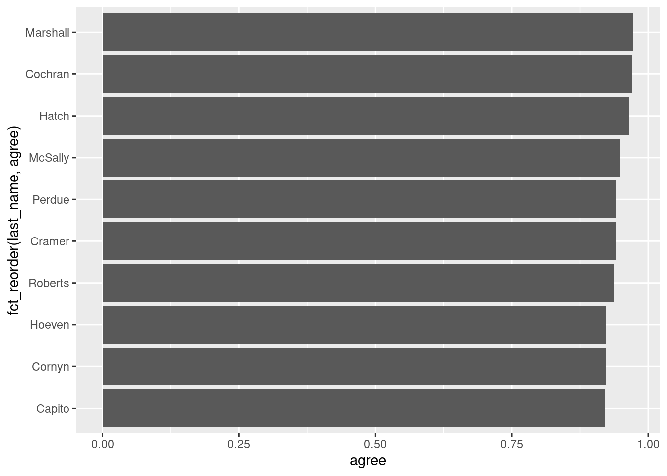 We might want to (1) select the top 10 observations and (2) order the bars according to the agree values. We can do these operations with slice_max() and fct_reorder(), as shown below: