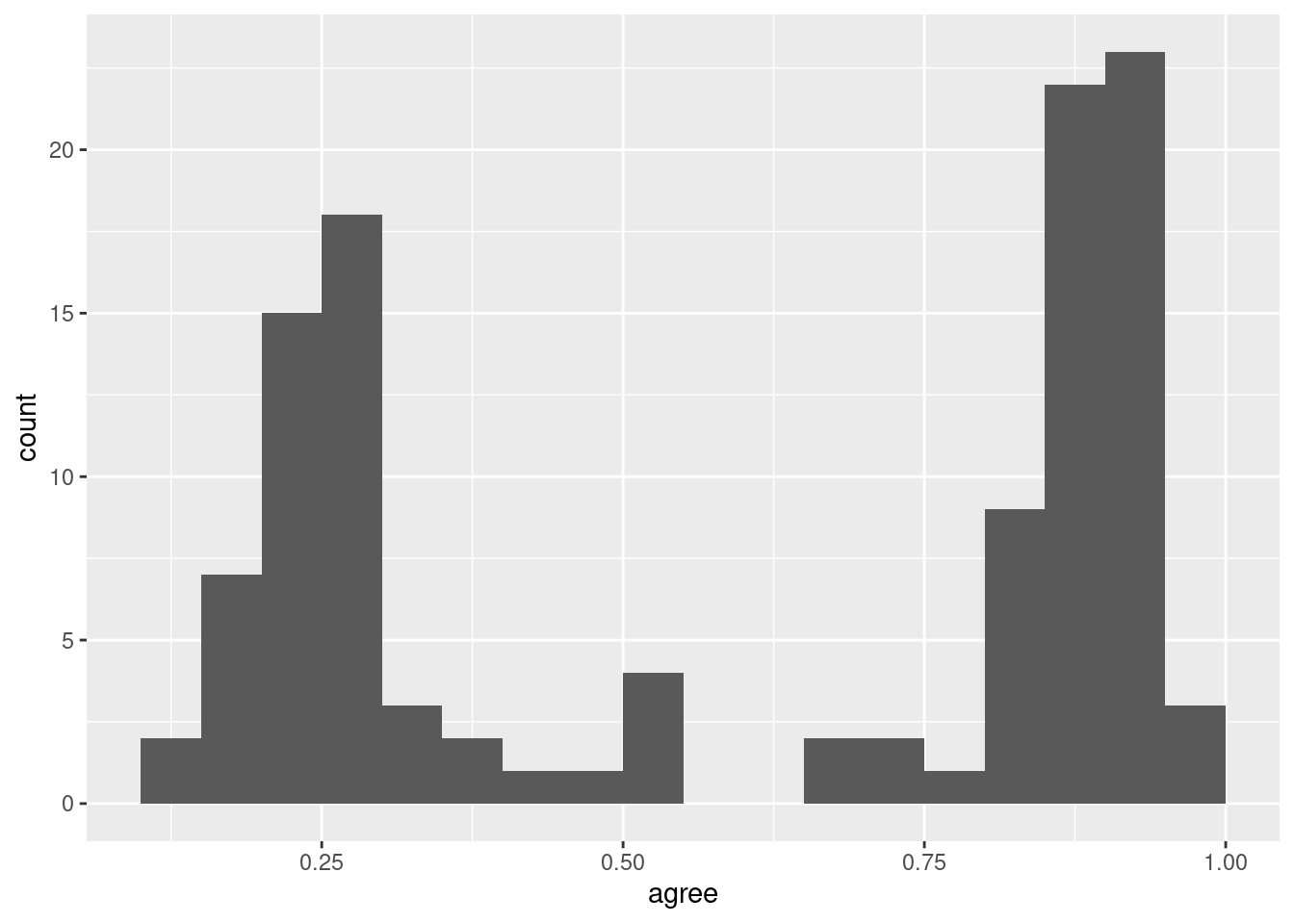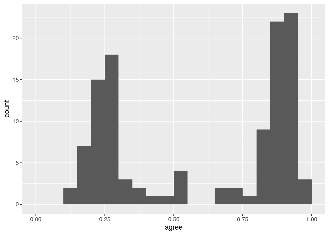 ggplot(trump_scores_ss, aes(x = agree)) +geom_histogram(binwidth =0.05, # draw bins every 0.05 jumps in xboundary =0, # don't shift bins to integersclosed ="left") # close bins on the left