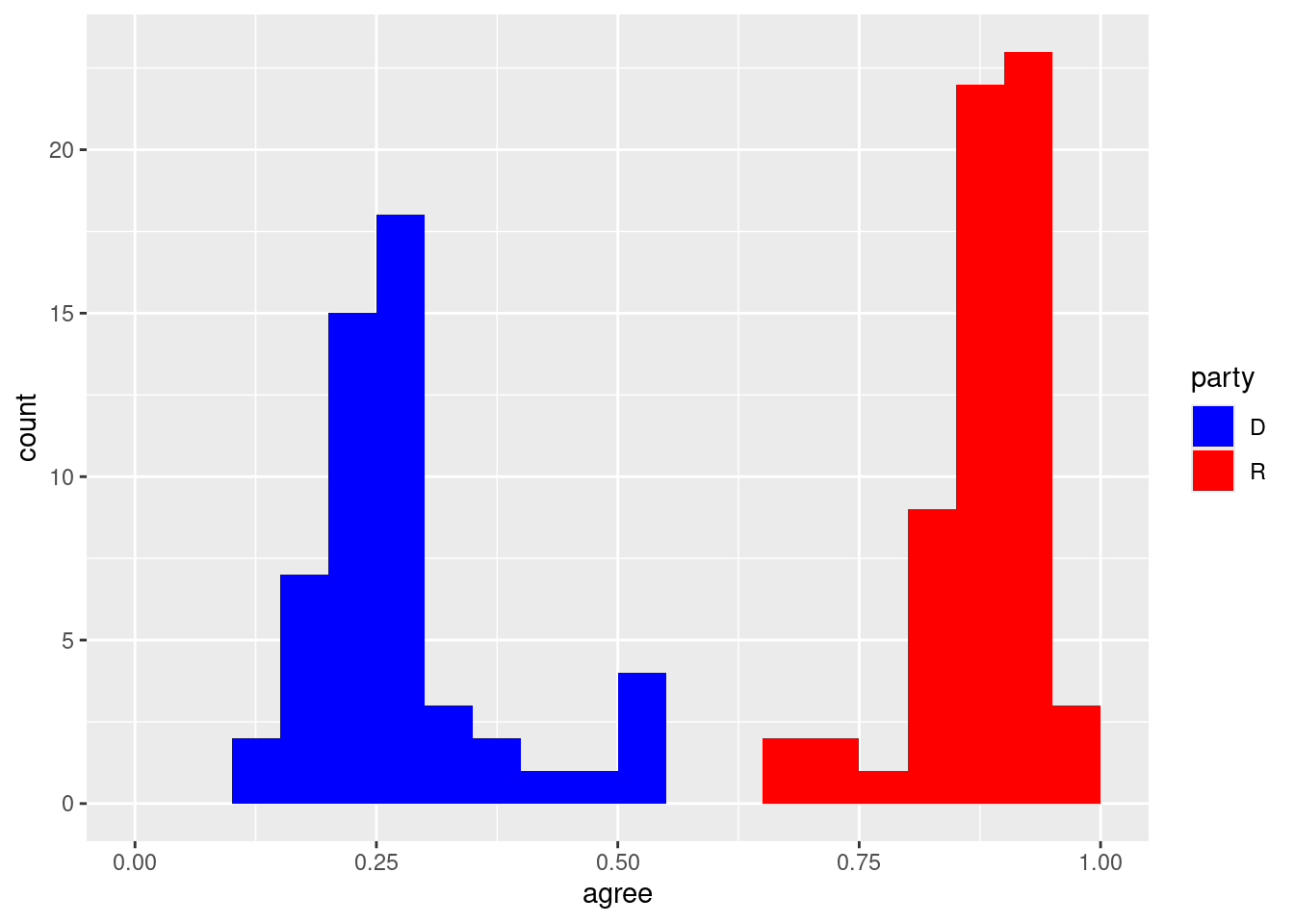 trump_scores |>filter(num_votes >=5) |># to filter out senators with few data pointssummarize(mean_agree =mean(agree),max_agree =max(agree),min_agree =min(agree),.by = party) # to group by party