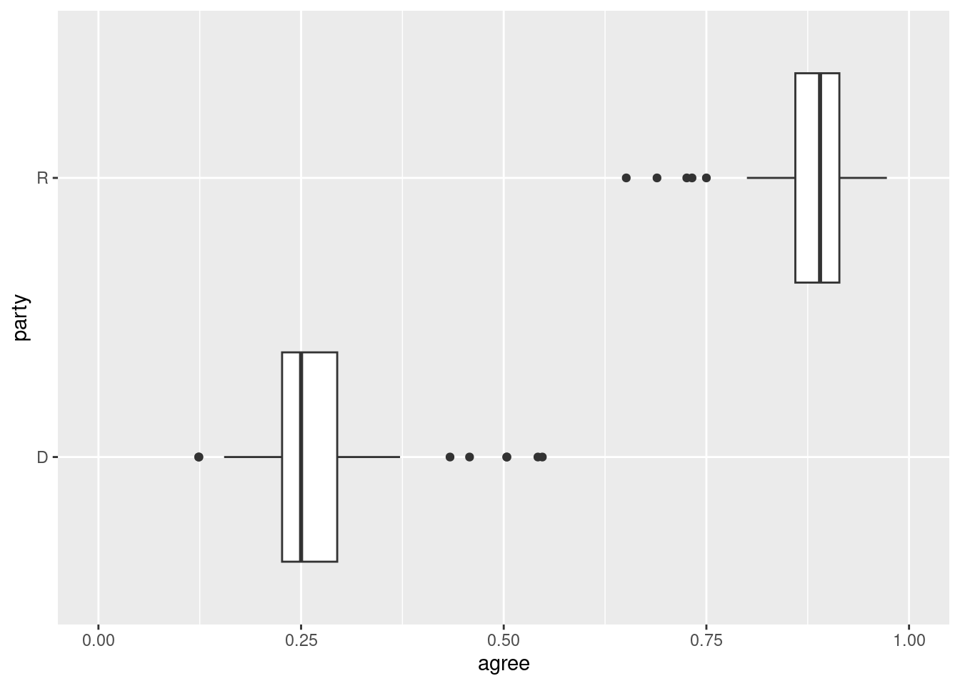 ggplot(trump_scores_ss, aes(x = agree, y = party)) +geom_boxplot() +scale_x_continuous(limits =c(0, 1)) # same change as before