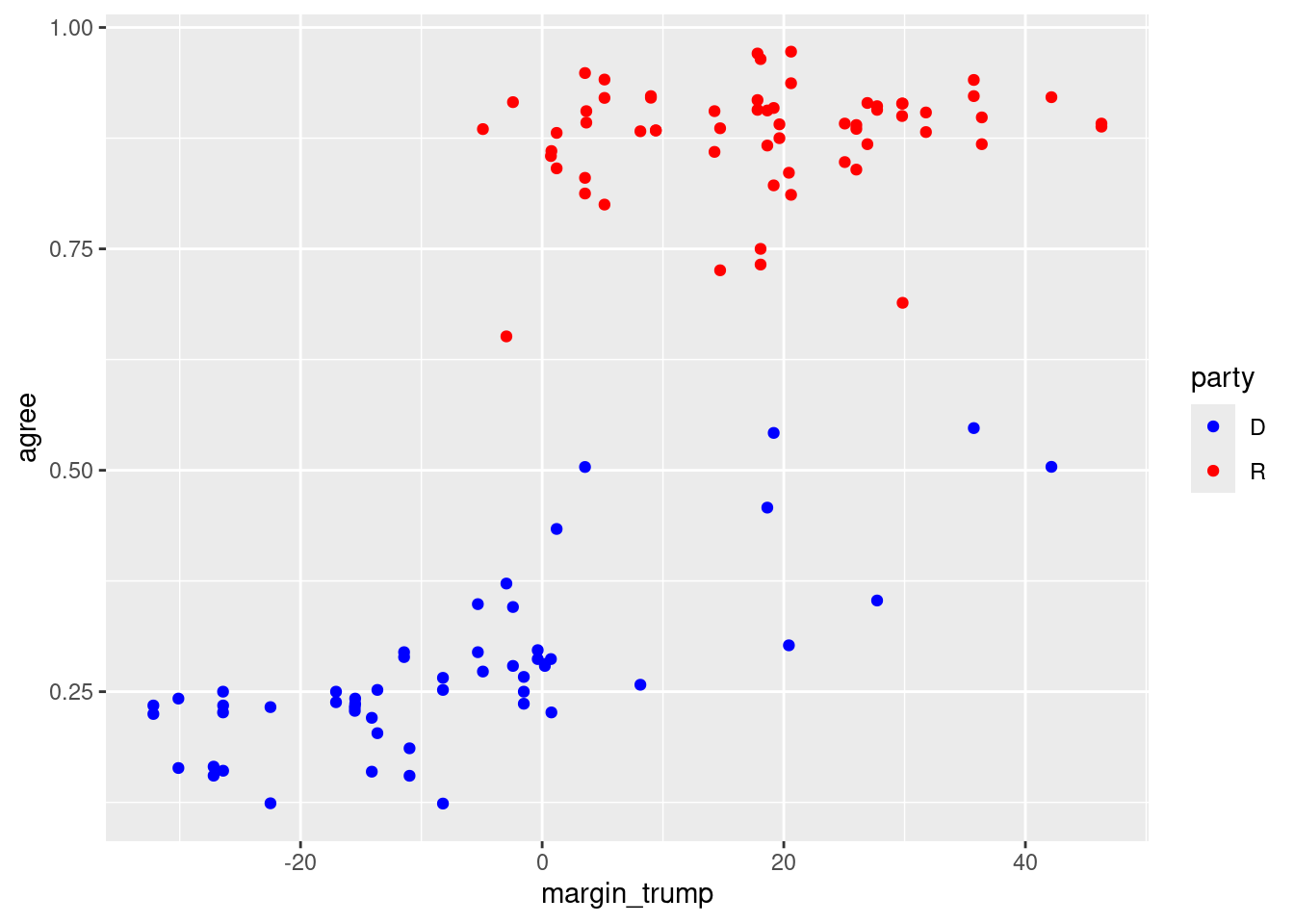 ggplot(trump_scores_ss, aes(x = margin_trump, y = agree, color = party)) +geom_point() +scale_color_manual(values =c("D"="blue", "R"="red"))