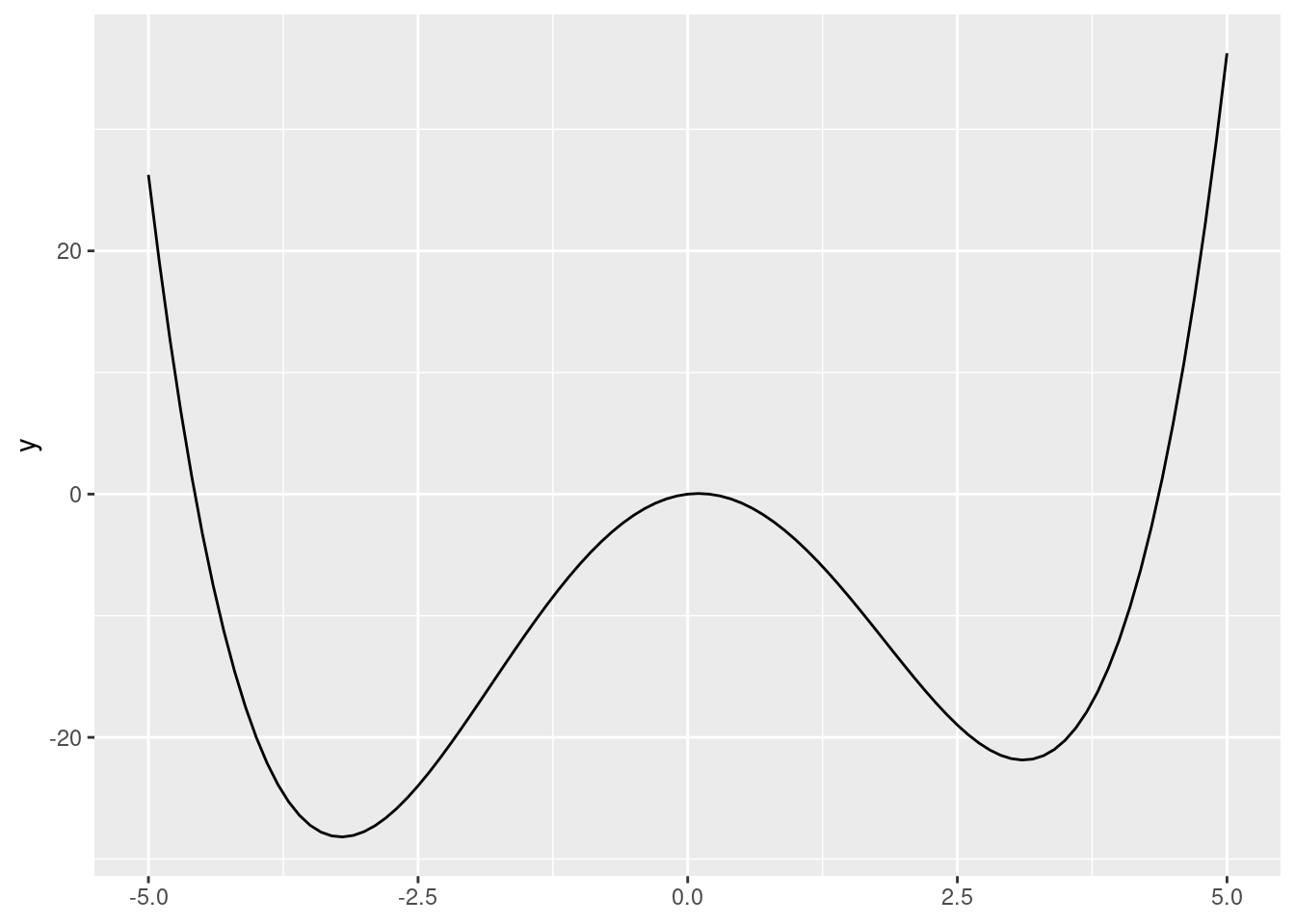 stat_function(fun = function(x){1/4 * x ^ 4 - 5 * x ^ 2 + x},