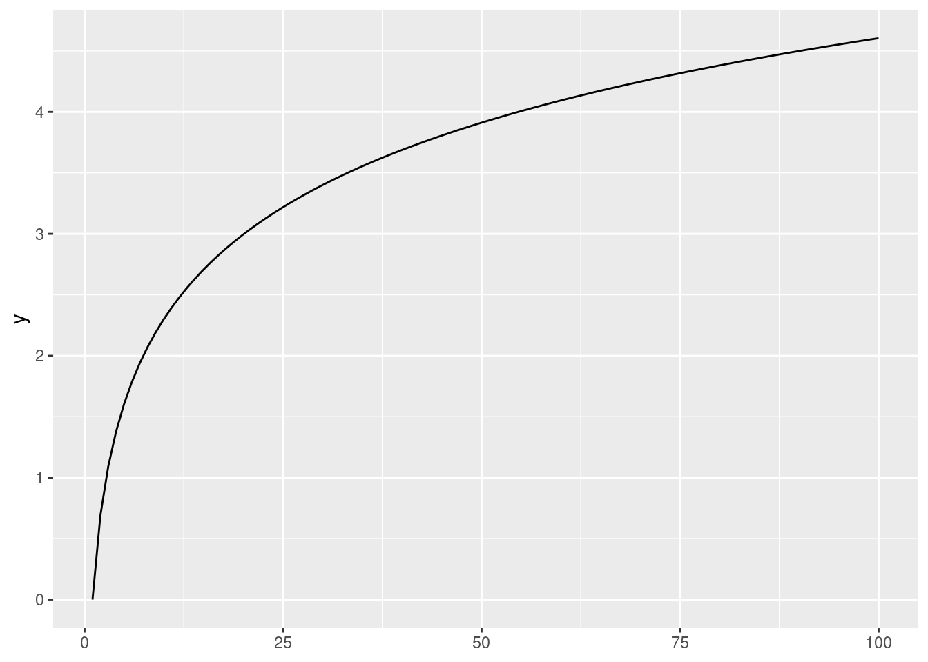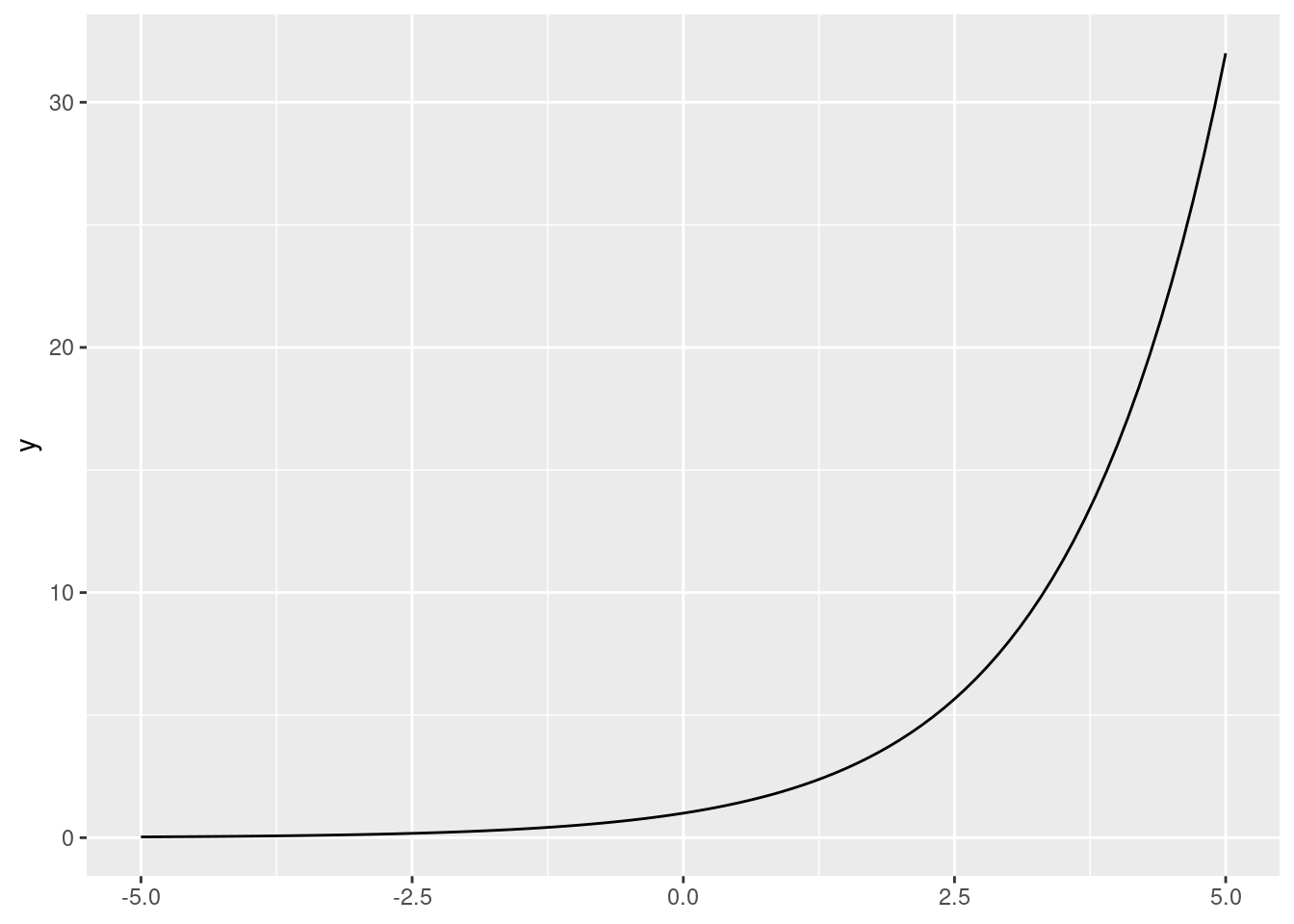 We can also plot logarithms. Remember that \(ln(x)\) \(\forall x<0\) is undefined (at least in the real numbers), and ggplot2 displays a nice warning letting us know!