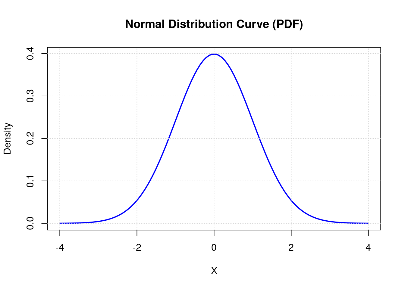 In R, dnorm() gives us the PDF of a standard normal distribution (\(Z \sim N(0, 1)\)):