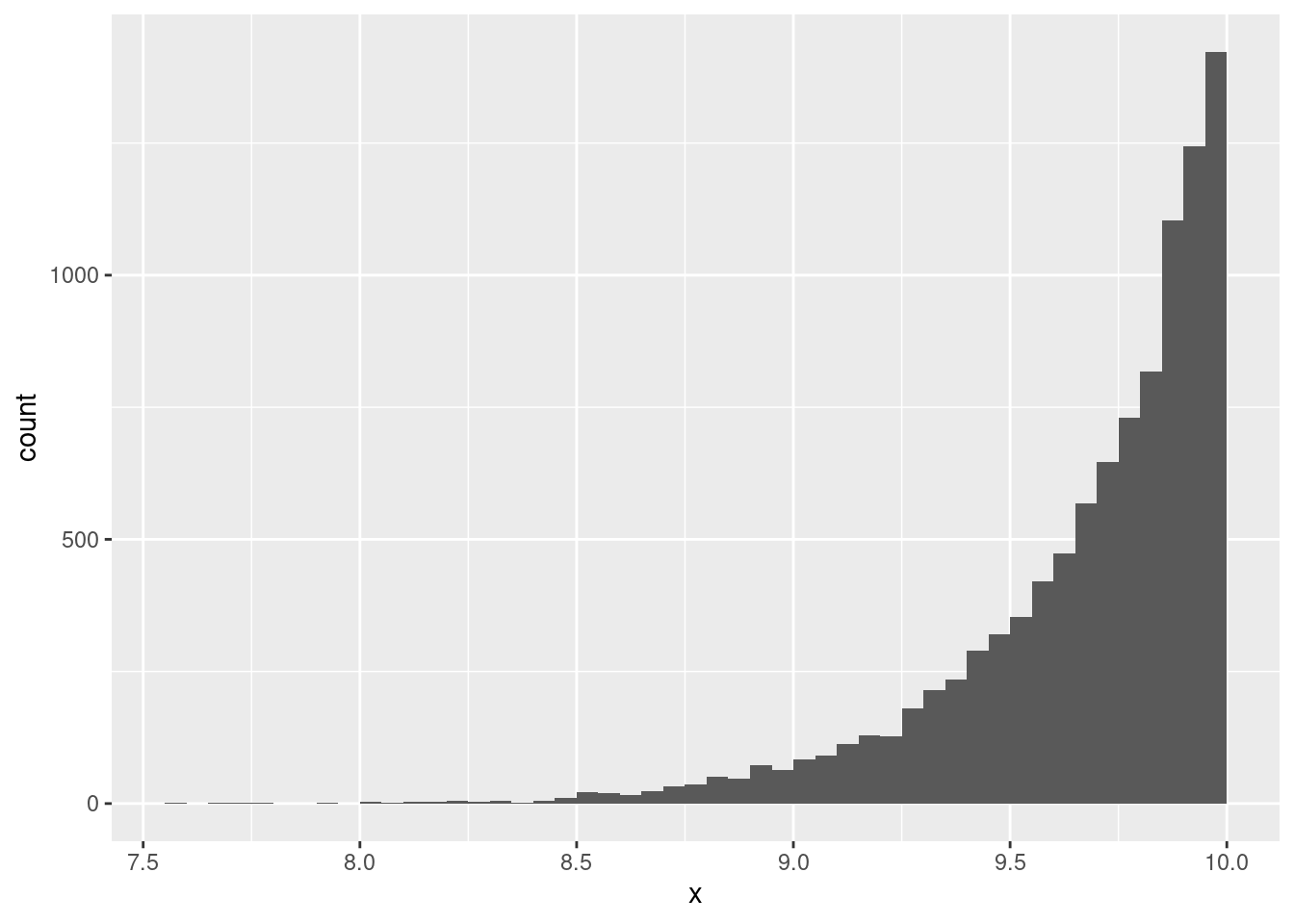 Simulate drawing an n=30 random sample from a \(X \sim U(0, 10)\) distribution and take its maximum value.