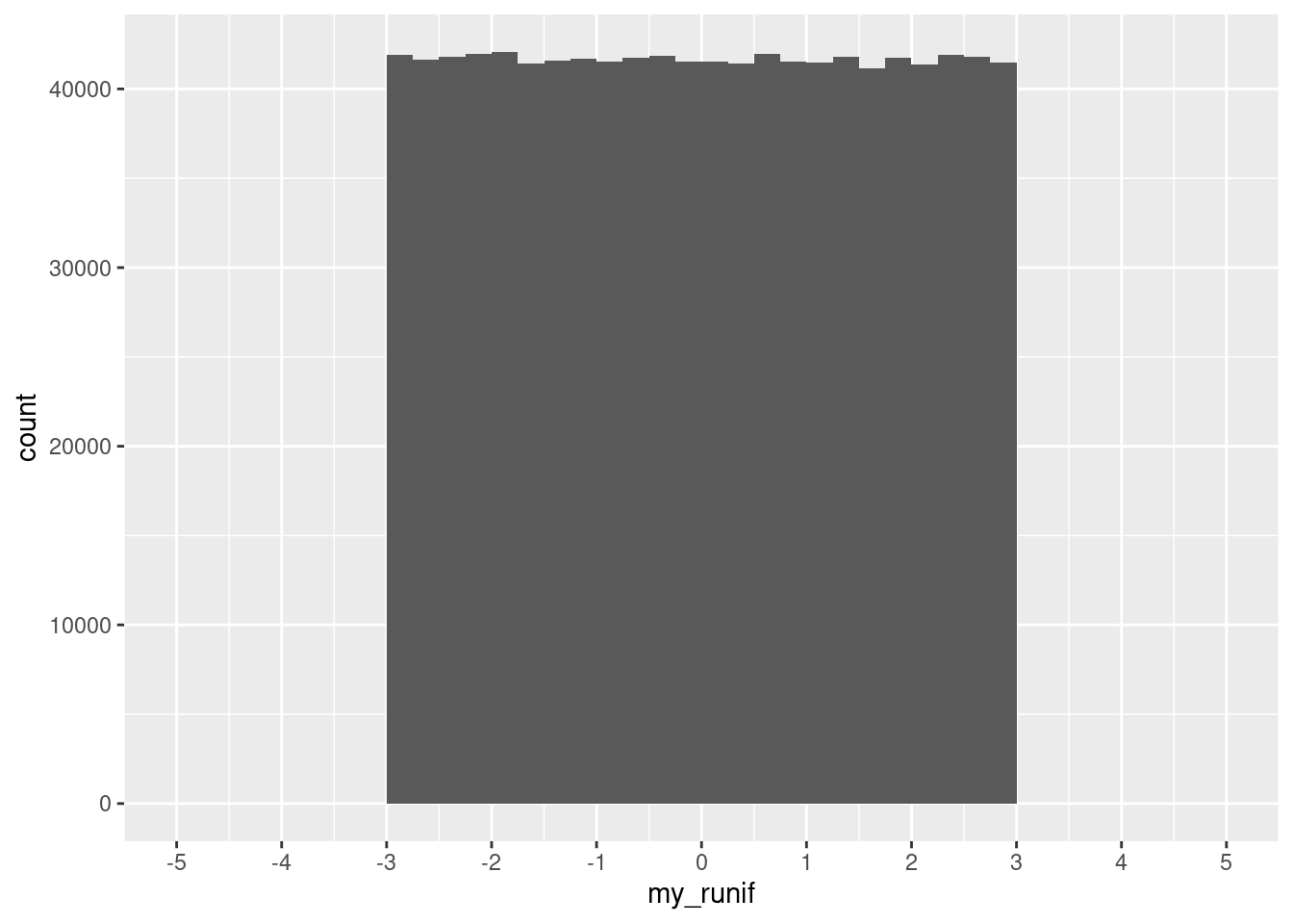 my_runif <- runif(n = 1000000, min = -3, max = 3)ggplot(data.frame(my_runif), aes(x = my_runif)) +